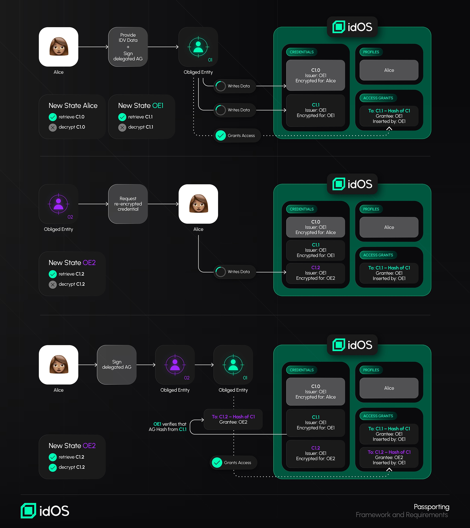 As introduced under the KYC Re-usability section, for Passporting within idOS to take place there are at least two obliged entities involved and only entities subject to AML and Combating the Financing of Terrorism ("CFT") obligations, such as conducting Customer Due Diligence measures (i.e. obliged entities) are eligible for Passporting within idOS. Users facilitate the process by giving Access Grants for their encrypted credentials.