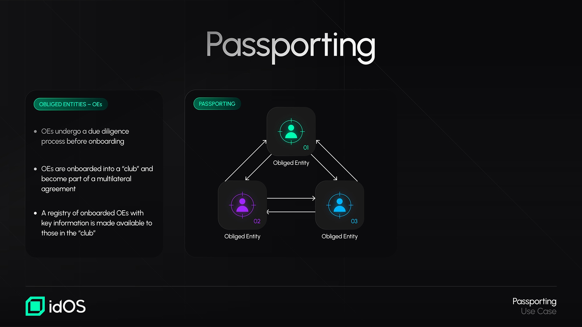 Obliged entities that wish to benefit from Passpoting within idOS become members of a permissioned “club,” provided they successfully complete the onboarding process. Such onboarding process includes becoming part of a multilateral agreement and undergoing a due diligence process, including checks for subjection and alignment with Customer Due Diligence measures, retention, and supervision/monitoring.