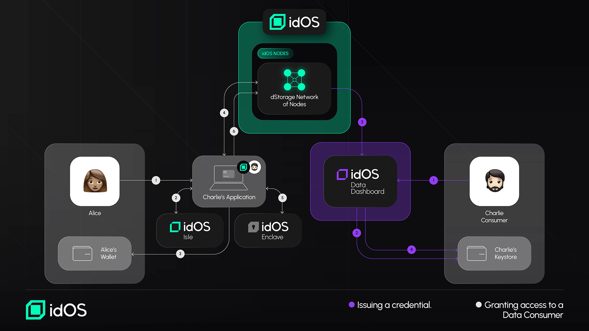 **(A) Granting access to a Data Consumer:** Alice grants Bob access to her data by (1) going to a integrated idOS Issuer or Consumer Application, optionally interacting with the idOS Isle (2), creating an access grant and (3) approving the transaction in her wallet. The Access Management Protocol is (4) updated, which in directly updates the idOS nodes. The encrypted credential is retrieved from the idOS, decrypted via the idOS enclave (5), reencrypted for the recipient (Charlie) and placed back into the idOS (6). Charlie can now see Alice’s data on a dashboard, and/or get it from a node. (see next flow)\