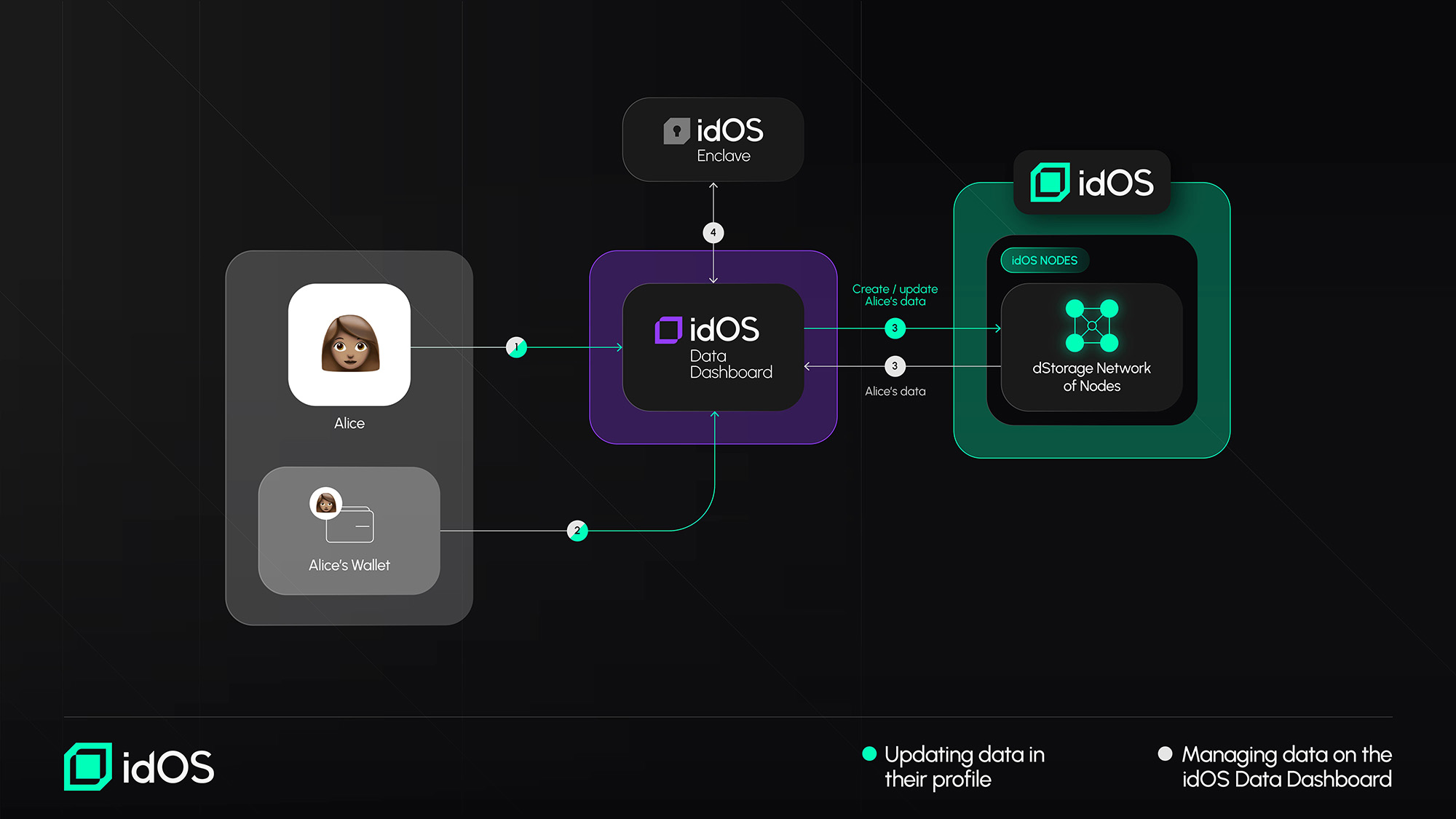 **(A): Accessing Data in the idOS Profile:** For Alice to see her data on a dashboard (e.g. the [User Data Dashboard](https://app.gitbook.com/o/CTEccIGTIOCKYOoZR03F/s/HHuxcxHW3wWO2HhMI3B3/how-it-works/functionality/user-data-dashboard)), she needs to (1) go to a data dashboard and (2) sign a message transaction with her wallet for the dashboard (3) to retrieve her idOS data. Afterwards she needs to decrypt the end-2-end encrypted data via an implemented idOS Enclave interface (4).\