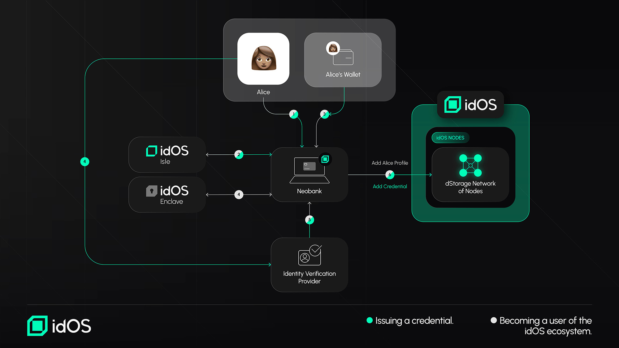 **(A): Joining the idOS ecosystem:** A new user (in this case Alice) joins idOS by (1) going to any integrated idOS Issuer or Consumer Application. If the integrating dApp uses the idOS Isle Alice will interface accordingly (2). Alice verifies her wallet (3). (4). Alice defines a secure encryption key seed via the idOS enclave. (5) The idOS Data Issuer ("Neobank") creates Alice’s idOS entry and adds her wallet to her data store. \